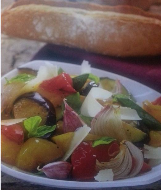 лук, баклажан, перец сладкий - разных цветов, цуккини, чеснок, порезать, сложить в посудину для печи, полить парой ложек масла, посолить, поперчить, перемешать, чтобы все овощи обволоклись маслом. В печку 400 фарингейт, готовить где-то 40 минут.