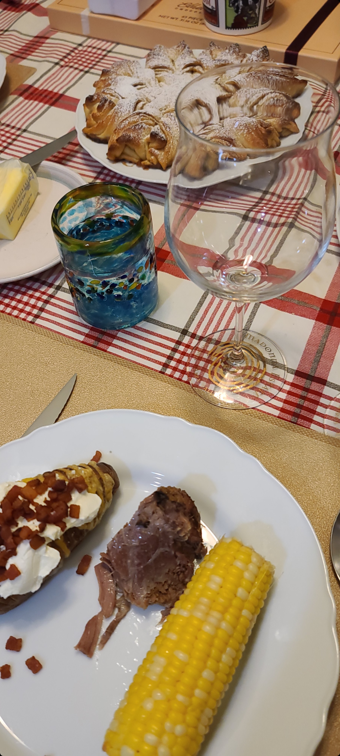 А у нас leg of lamb, hassleback potato, corn and Christmas starbread.