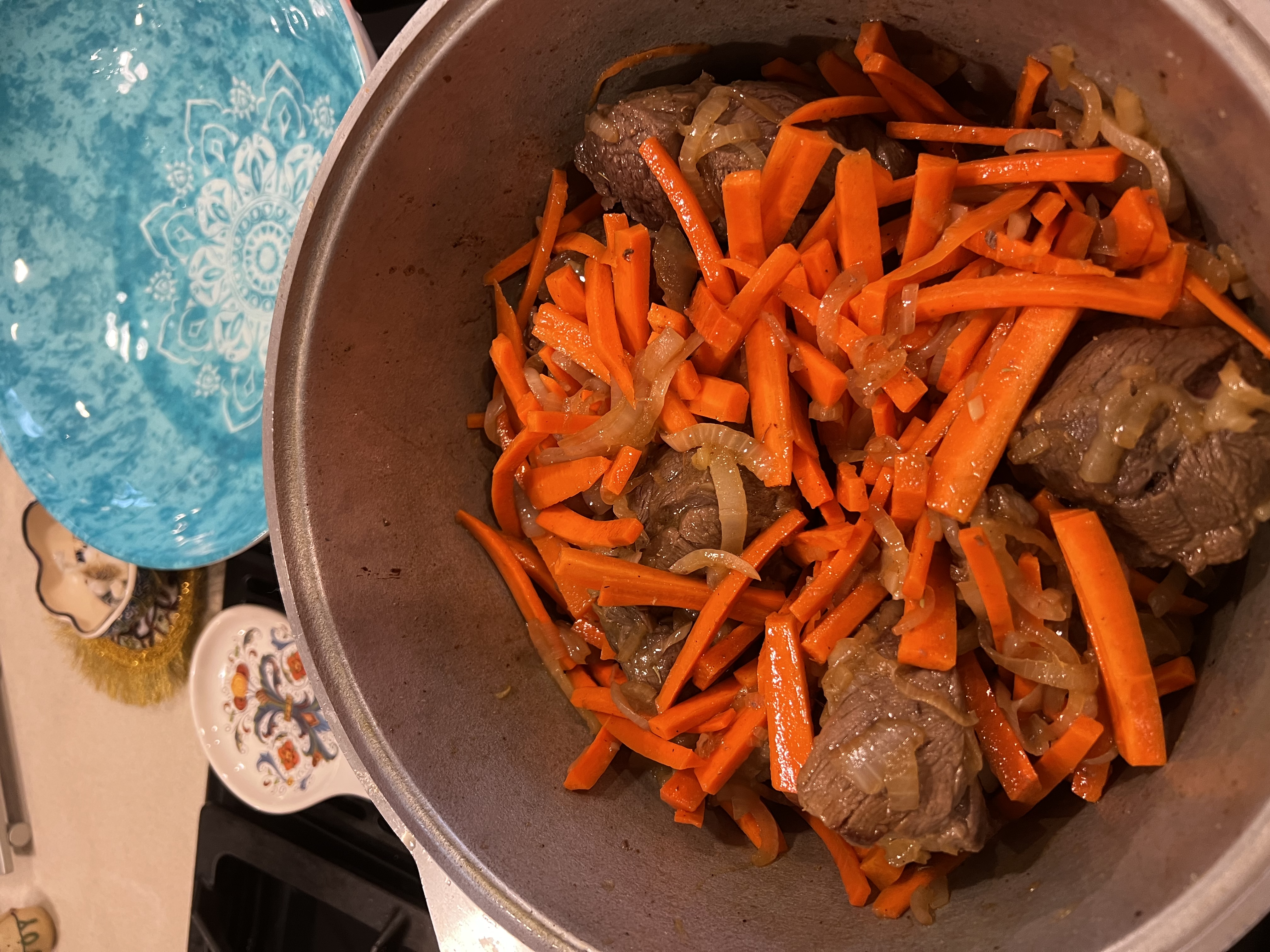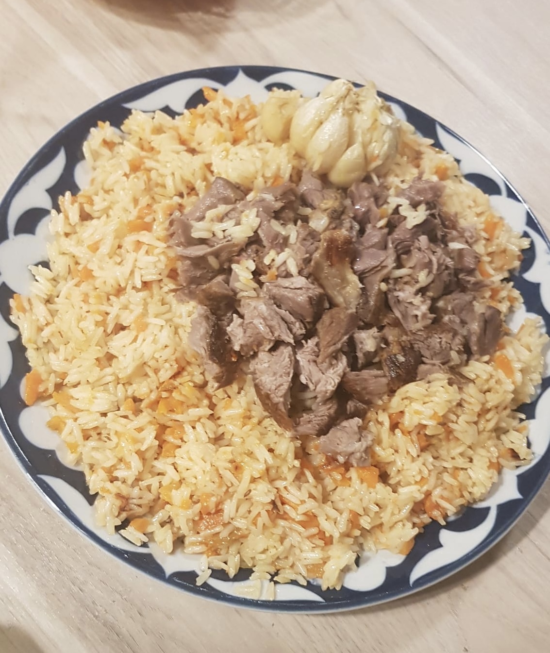 Девочки, спасибо за плов Пишу рецепт. Иградиенты: - 1кг мяса - 1кг риса - 1кг моркови - 1 литр воды - 2 большие головки лука - 2 больших половника масла =250мл - 2-3 головки чеснока на любителя (я люблю:)) - соль, перец черный, кориандр, зира - все по вкусу. Приготовление: Я должна здесь сделать поправку: я в самом начале жарю мясо без масла - всегда, не зависимо от блюда. Когда оно хорошо поджариться, добавить масло. Вы делайте, как вы привыкли, как любят ваши домашние. 1. Жарить мясо большими кусками 5Х5 см. (перед подачей, порезать мелко) 2. Когда мясо покроется золотой корочкой, добавить порезанный полу-кольцами лук. Все жарить на большом огне. Все жариться очень быстро, так как здешнее мясо и продукты готовяться быстрее, думаю потому, что все рафинированное. 3. Добавляем морковь, порезанную соломкой. Одновременно, добавляем все специи. Солите хорошо, так как соль нужна еще для риса. Постоянно все помешивайте, не отходите, все жарится быстро. Я не люблю когда все мягкое как каша. 4. Когда морковь опадет, добавляем воду. 5. Довести до кипения, накрыть крышкой, НЕ закрываем, оставляем маленькое окно. Убавляем огонь до средне-маленького, чтобы булькало, и вот теперь можно отойти от плиты на 30-45 минут, в зависимости от мяса. Я впервые готовила из баранины - оставила на 45-50 минут - отлично получилось. Была нога баранья. Говядина возьмет меньше времени, а курица еще меньше. 6. Если Вы любите чеснок в плове - целый чеснок - то этот пункт для Вас. Через 30 минут покипывания бульона (не знаю как называется эта часть плова), закидиваем целый чеснок. 7. Последнее: добавляем хорошо промытый рис. Увеличить огонь до средне-большого. Как только вода исчезнет, уменьшить огонь на самый маленький и закрыть плотно крышкой на 15-20 минут, в зависимости от типа риса. 8. Перед подачей: мясо выложить, плов хорошо перемешать, и подавать по вашему вкусу. Приятного аппетита:) Добавлю пару фото.