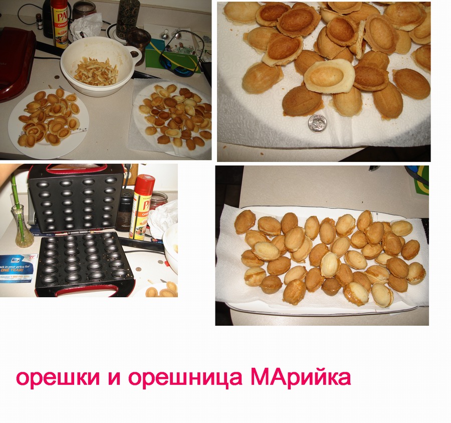 седни прислали орешницу, купила через ибей,называется она Марийка(выше есть ссылки) и сделана в Китае- 80долл. тесто сготовила по обычному рецепту- мука-масло-яйца-сахар. начинка-полбанки вареной сгущеник(готовая варенка в Крогере продается) и взбила с 125 грамм слив масла. плюс чуток крошек от скорлупок готовых добавила. вобщем китайская форма печет орехи меньшего калибра  ,чем советские. я вначале,не уверена была..мало ли что помнится из детства,и деревья были большими  ..но пройдя по ссылкам кулинарных русск сайтов(say7) убедилась, что Марийкаорешница скорлупки печет миниатюрнее и не такие глубокие я никогдане пекла орехи. так что первый заход был с ошибками- слишком большие кусочки теста сунула в ячейки.они вылезли по краям и скрепились с другими орехами. в след заход положила в полтора раза меньше. вот результат. для сравнения скорлупка и десюнчик) орехи вышли не оч аккуратные..но это первый опыт.щас они в холодильнике.