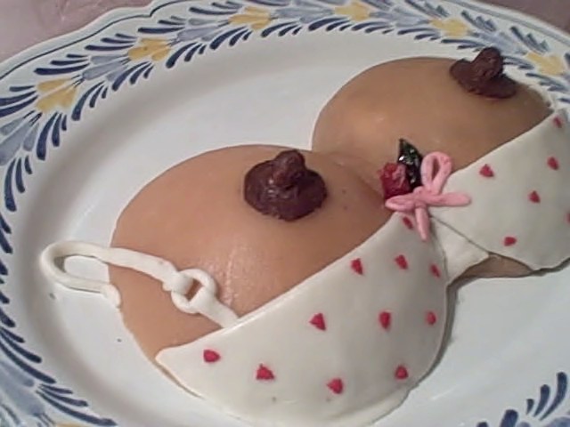 Ой, девы! А вот и я! Целый день не могла фотки в комп закачать с камеры Зацените теперь и мои сиськи Внутри бисквит и крем ПТИЧЬЕ МОЛОКО. Чтобы торт получился более мужским, я нафигачила в крем почти 200г рома  Боялась, что крем будет жидким, но вроде все отлично застыло. И вкус получился отменным. Мастика меня не подкачала, легла ровненько и держалась превосходно. А вот лифчик подкачал и не нравится мне Дело в том, что к нам неожиданно друзья нагрянули в гости, а я как раз только успела сиськи мастикой обтянуть и разогрела шоколад для лифчика. И вот пришлось этот лифчик в дикой спешке рисовать, не было времени 10 минут подождать, пока разогретый шоколад станет гуще, тогда им удобнее рисовать и он более послушный. Пришлось творить прям жидким шоколодом и он ужасно лился из корнетика и получилось наляписто немного. Но друзья и муж все-равно заценили. Муж был в диком восторге, а друзья так вообще фоткались с этим тортиком во всех ракурсах