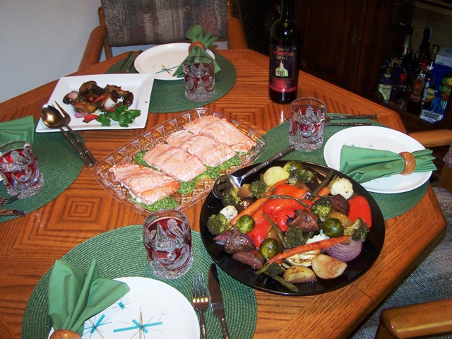 Ну что, мы провели мероприятие: поели, поболтали, посмотрели "Тот самый Мюнхаузен", который у меня с английскими субтитрами. Это был хит.  На ужин у нас был Grilled Plantain Salad, лосось с песто из кинзы и грецких орехов, фруктово-овощное ассорти, запеченное в сладком вине с базиликом, белым перцем, паприкой и орегано (сиреневый лук, баклажан, молодая морковь, брюссельская капуста, стручковая фасоль, цветная капуста, брокколи, красный сладкий перец, красная груша (от неё был такой аромат - ммм...), картофель и крупные грибы Портобелла). Дессерт принесли гости. Рекомендую этот вариант, когда время ограничено: он очень вкусный, но быстрый, так как овощи не требуют длительной подготовки, салат и песто можно сделать заранее, рыба запекается за 10 минут, овощи - около 30-40.