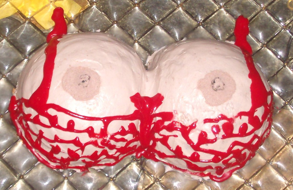 Отчитываюсь. Из меня декоратор совсем никакой, но зато вкусно было. Тело я айсингом покрыла (ненавижу его на вкус правда), Почему то гладко и ровно у меня не получилось,. Лифчик - рваные кружева ( если конечно это можно кружевами назвать. ) Муж долго смеялся, громко, потом шватил нож и по варварски начал отрезать соски и шрам на одной сиси нарисовал. Жуть.