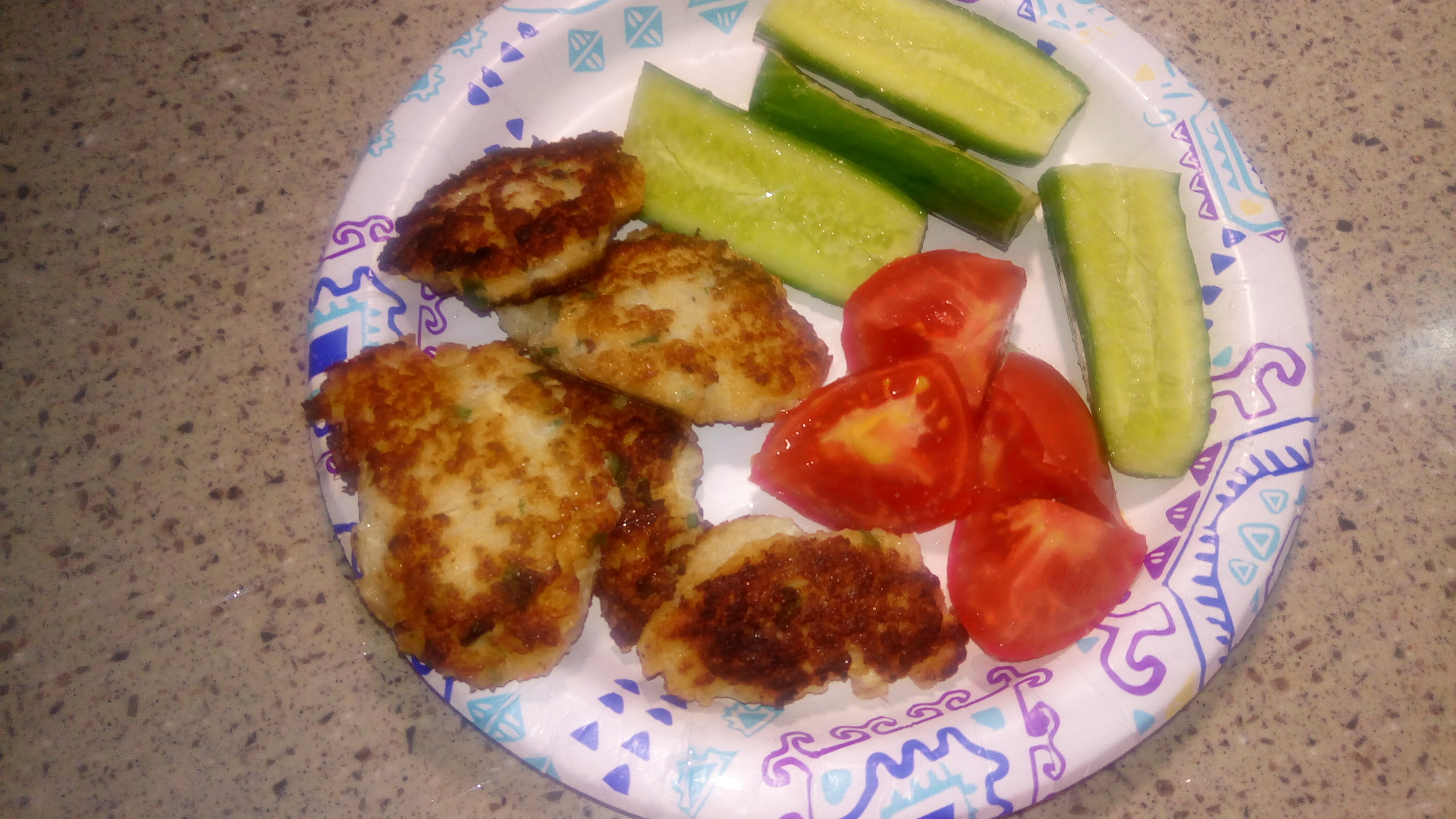 На ужин я приготовила новое блюдо. Рецепт придумала сама. Рыбные оладушки . Пальчики оближешь.