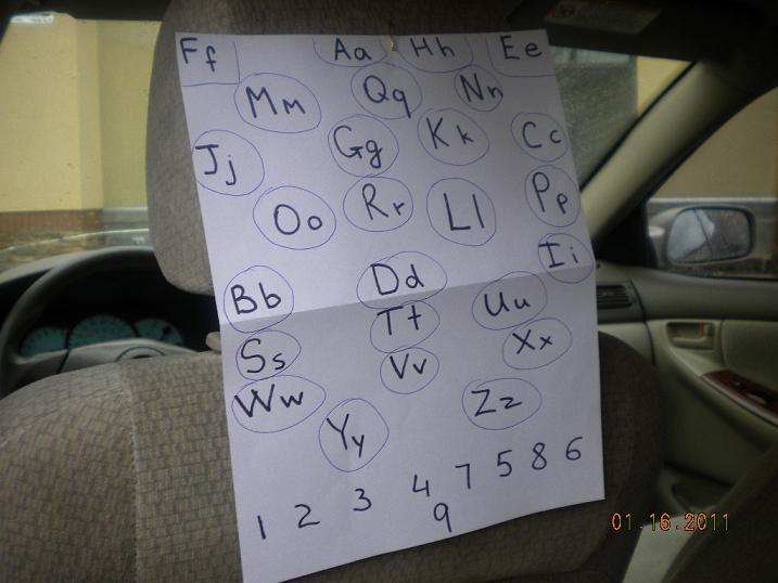 Не знаю куда запостить... Вот я детей своих так алфавиту учу-может кому пригодится. Каждый раз сажаю-высаживаю ребенка из машины-показываю буквы или они мне показывают и называю(т). Я так старшую учила,теперь сделала для младшей и у меня старшая просит,чтоб я русский алфавит сделала. Придется сделать. Потом также деньги будем учить. На листок прикреплю монетки скотчем и рядом напишу их эквивалент. Я где то этот способ в инете высмотрела.