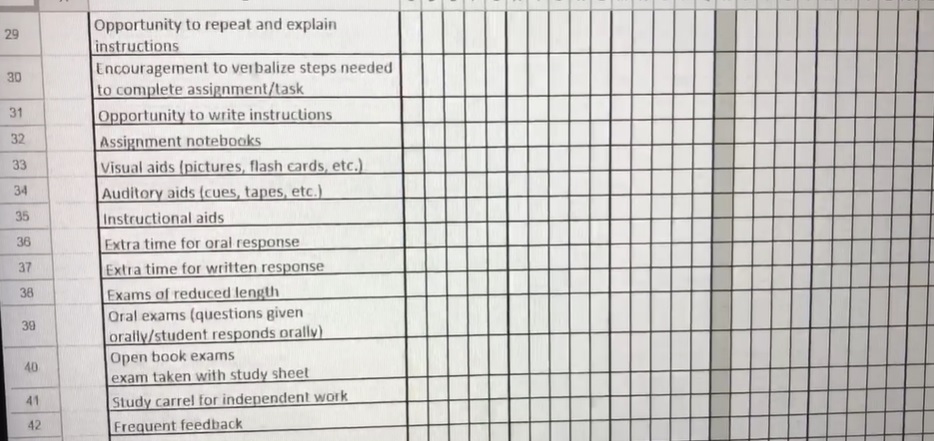 Если честно, я серьёзно рассматирваю уходить. Я себе даю две недели и посмотрю что будет. На нас ещё навесили просто кучу административной работы. Портянки писать на всех SPED студентов и тех кто на IEP. Вот на фото, пунктиков на 70+ Нужно взать файл ученика у которого план accommodations, сравнить с этой портянкой. Удалить из портянки те accommodations которые к нему не относятся. Потом каждый день отмечать на портянке какие из этих accommodations я использовала с этим учеников в классе. Учеников у меня около 80 в данный момент. Не все на accommodations, но даже если 10, к примеру, то это сколько дополнительного времени в день на всех.