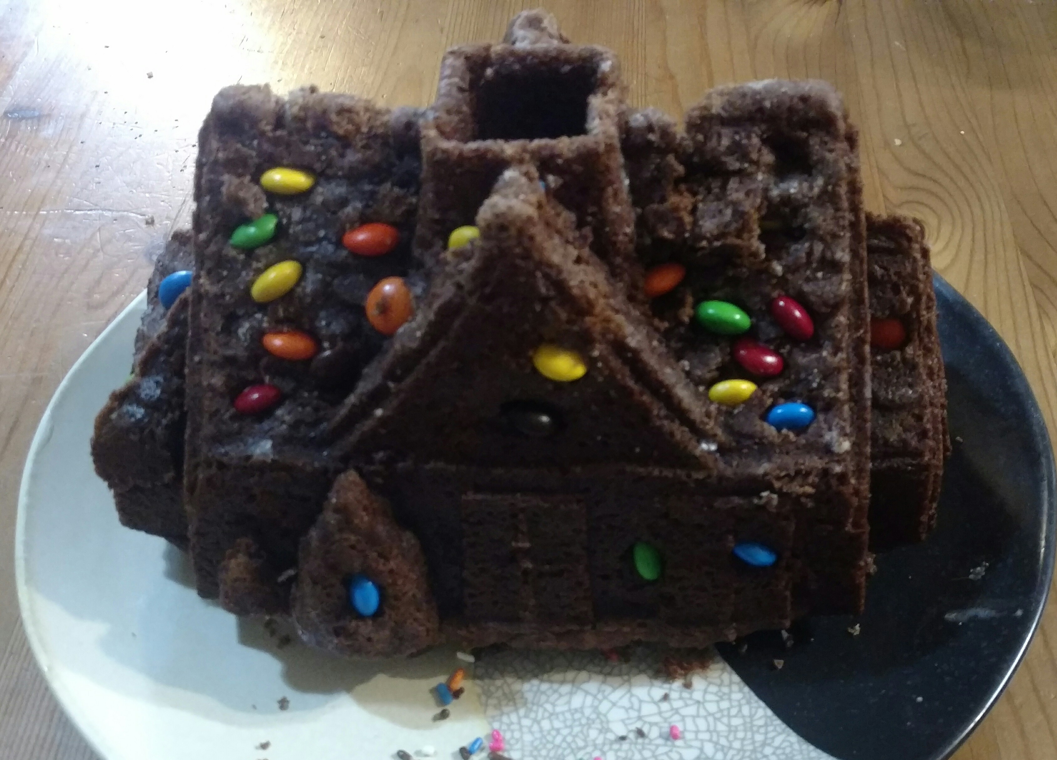 Испекла домик по новому рецепту с хурмой и специями. Какао не добавляла, а кекс получился на вид шоколадный. Рецепт понравился, в следующем году обязательно сделаю опять, только сахара поменьше на мой вкус надо. Вкус хороший и несухой получился. Извините за неказистый вид, дети уже успели примять его, украшая. Еле успела сфотографировать, так как дети сразу же захотели съесть.