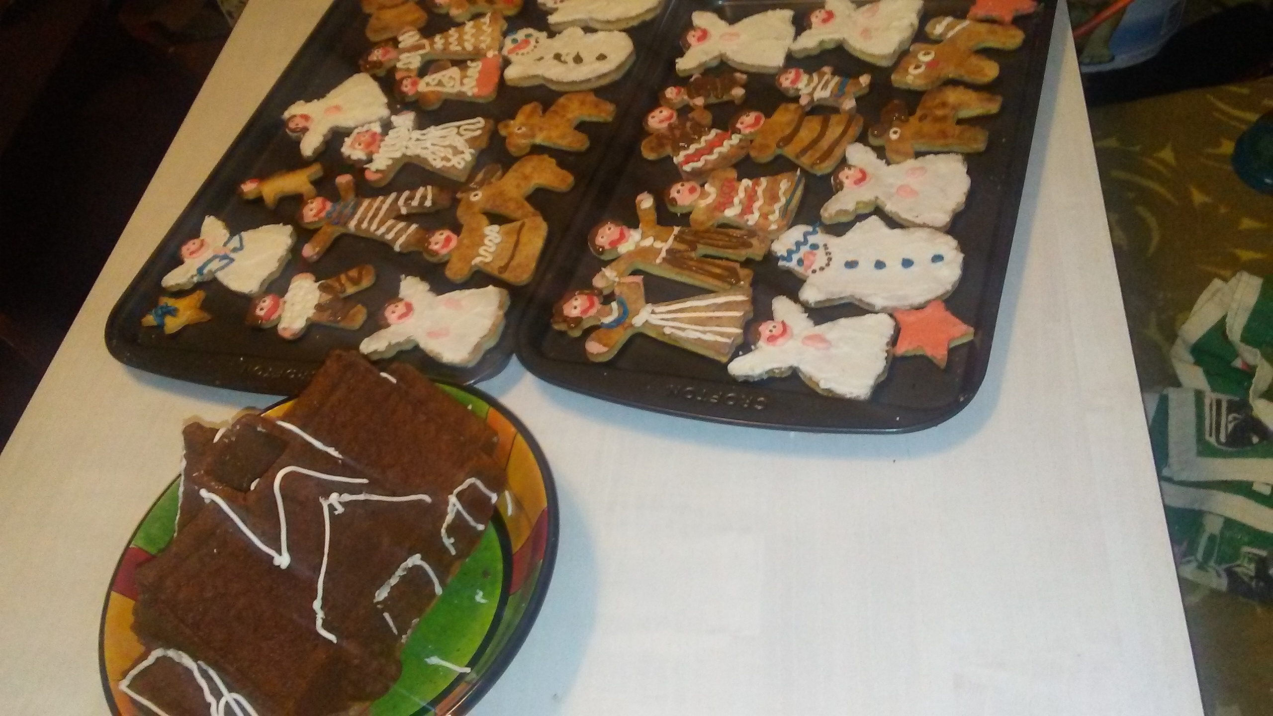 Спасите меня срочно !!!! я давно ничего не пекла и рецепты все утеряны , хотя и навыки видать тоже. стала сегодня печь домик ( спасибо кто посоветовал форму купить, хоть домик на домик похож) рецепт взяла из интернета и домик получился немного недоделанный, тесто не поднялось, ну да ладно всеравно красиво. стала делать печеньки таже фигня , все взяла из интернета, получилось безобразие. дайте пожалуйста испробованый и надежный рецепт глазури, чтобы домик украсить как следует. а то та глазурь что я наделала засыхает моментально, ломается и тянется, ничего с ней приличного не сделать. вот что получилось... разве к холлувину только, может хоть домик получится нормально украсить. посыпать не получается, он жирный какой то и пудра как бы мокнет на нем и не видно ее, надо бы глазурь чтобы залить все