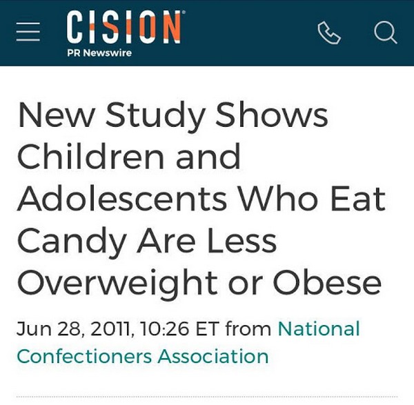 В ходе другого исследования утверждается, что дети, которые едят конфеты, весят меньше чем дети, которые не едят сладкого, а значит, сладкоежки меньше склонны к ожирению. И снова, к величайшему удивлению, обнаруживаем, что исследование было финансировано торговой ассоциацией, представляющей таких гигантов по производству сладкого, как: Butterfingers, Hershey и Skittles.