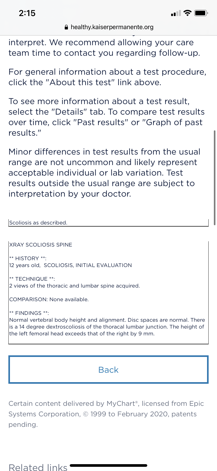 Дальше, на счет моей жалобы о разной высоте плечей. На осмотре ей сказали снять одежду и одеть жилетку. И под жилетку они не заглядывали. Позвоночник и плечи она сказала а давай лучше сделаем рентген. А сама она ушла на неделю в отпуск. Рез-т рентгена показал 14 degree dedtroscoliosis and 9mm difference in femoral head bones sizes. Какой-то дежурный педиатр послал нас сделать leg length xray study on 4/19, и потом говорить с ортопедом. Дал реферал к ортопеду через месяц(!) с 4 просьбы по имейлу. Прием по телефону. Лично к ортопеду на осмотр не пускают. Дал реферал к физикал тераписту через месяц тоже, видео аппоинтмент. Он даже ее не осмотрит и не прощупает ее кости и не проверит мобильность, чтобы сказать что делать и что не делать.