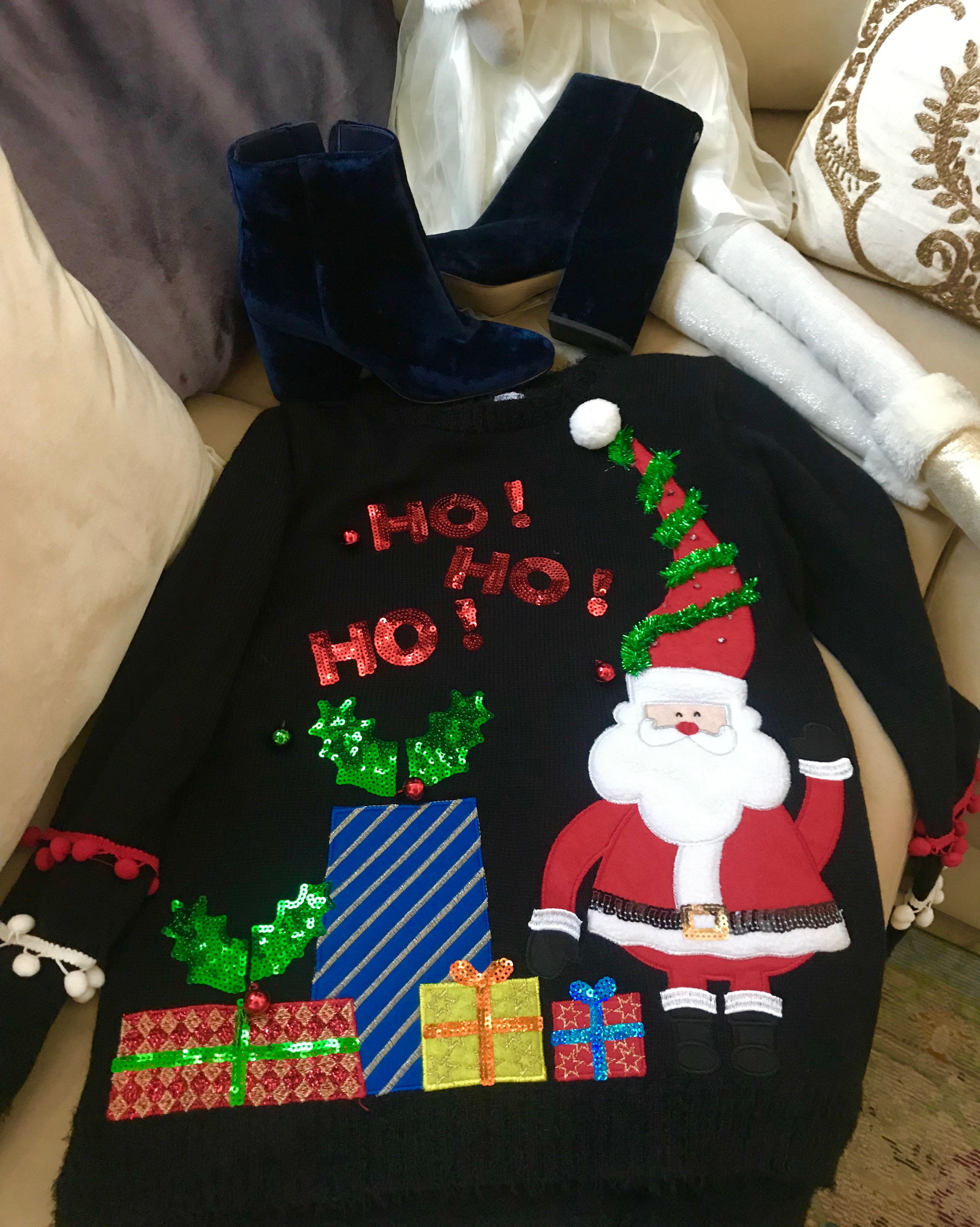 Девы, кто идет на агли свитер парти? Я вот купила себе, он черный, но там много цветов, как видно. Хочу вот эти шузы одеть они синие, какого цвета джинсы одеть?