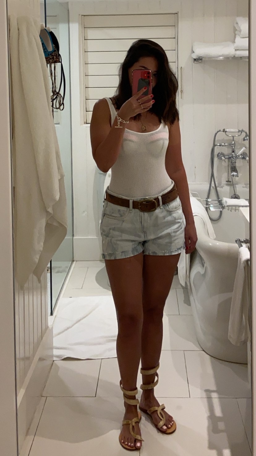 Вот так понавезу платьев, а потом хожу в джинсовых шортах, к ним винтажные ремень от Ральфи и мини гладиаторы из кожи рептилии. Боди waffle-knit cotton-blend, а что под боди кто нибудь узнаёт? В плане ювелирки я не люблю слишком коммерческие бренды, есть что-то от них но в основном стараюсь одеть что-то стильное и эксклюзивное (люблю исследовать тоже  ) Я уже черныш естественно, за пару дней.
