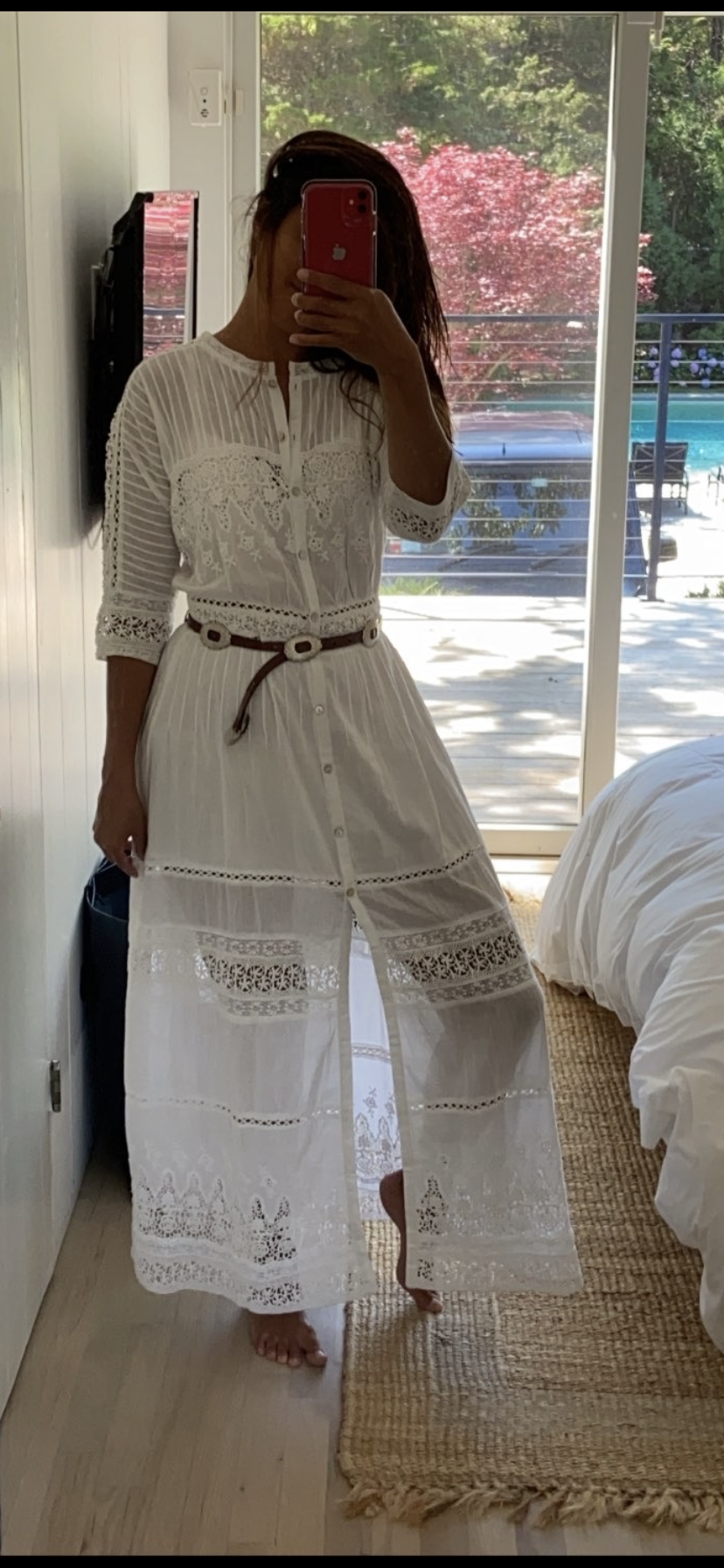 Hi babes I’m exhausted.... к нам пришли настоящие солнечные дни и мы на нашей парусной зависаем day&night. Строим новый дом, это умотало меня, готовка, работа, каждый день рухаю в кровать спим как убитые При этом так и не выходили ни на один ивент, ни в один ресторан... Очень скучаю по жизни в Сити, раньше ведь у нас было 50/50, город и деревня. А теперь я превратилась в полностью деревенскую деву. Ну а посему, держите мой out east наряд, хлопковое платье. Оно вне времени с элементами классического кружева (обычно я кружево терпеть не могу и не ношу). Простой силуэт этого макси-платья (спереди на пуговицах) украшен замысловатыми цветочными кружевными мотивами вдоль юбки и удобными рукавами средней длины. С его слегка облегающим лифом и ровным подолом до лодыжек это платье идеально подходит для женщины, которая хочет выглядеть одновременно сексуально и шикарно. Сохраню его навсегда.