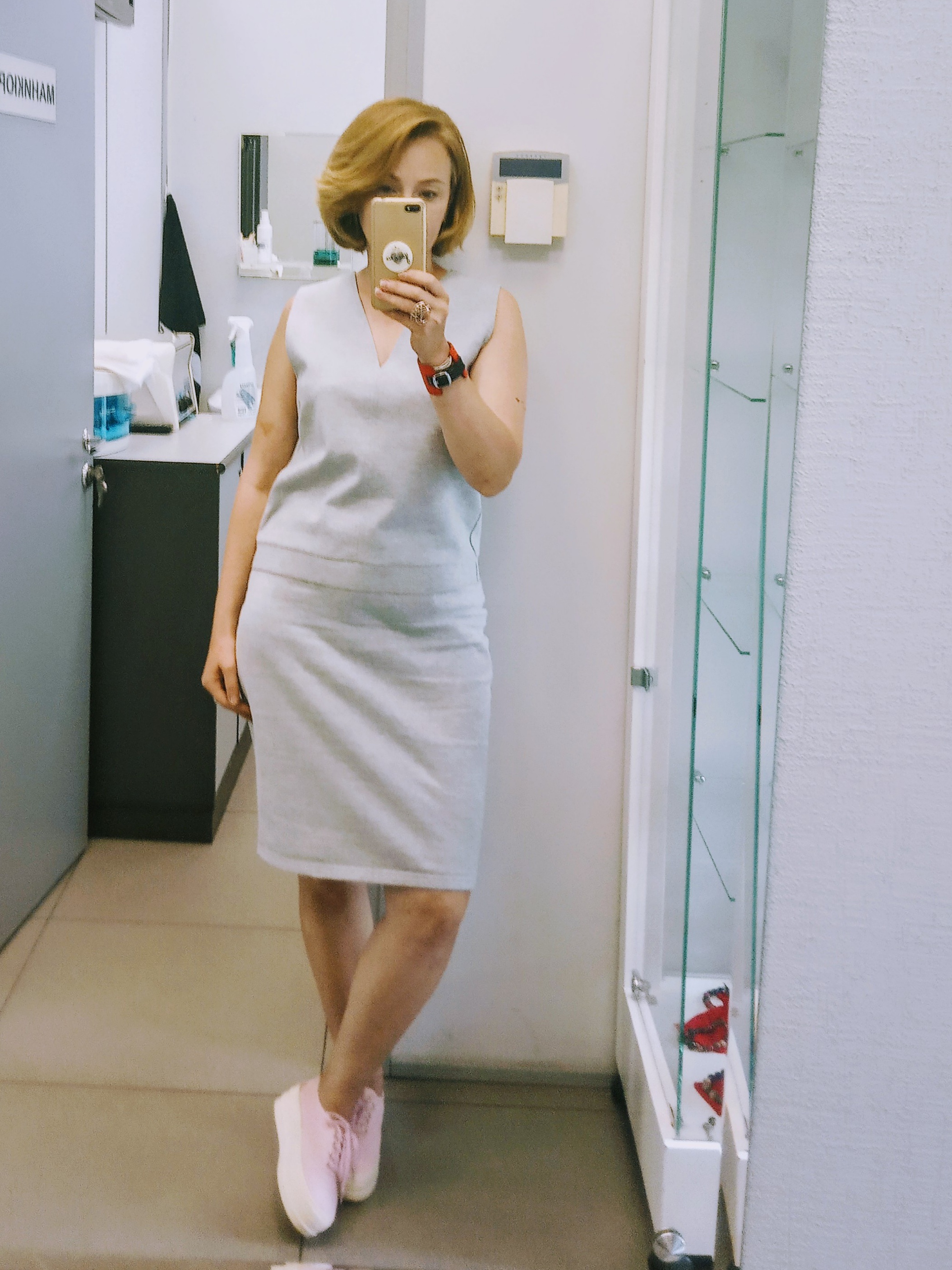 Хотела надеть платье, у него офигенский красный цвет.чистый. и не видно на фото, на подоле, декольте и рукавах такого же цвета красный бисер, переливается очень красиво. Крутилась вертелась, да все мне кажется неудобно, вдруг там вылезет или тут, держать надо осанку и живот Есть очень красивые ретро туфли, с бантом и перемычкой. Но как то уж очень нарядно показалось. Примерила с другой обувью, устала и не пошла в платье Вот этот серый костюмец нормален весьма. И удобен. Хочется принарядиться порой, но мне как то если красиво и "по фигуре" все время неудобно.
