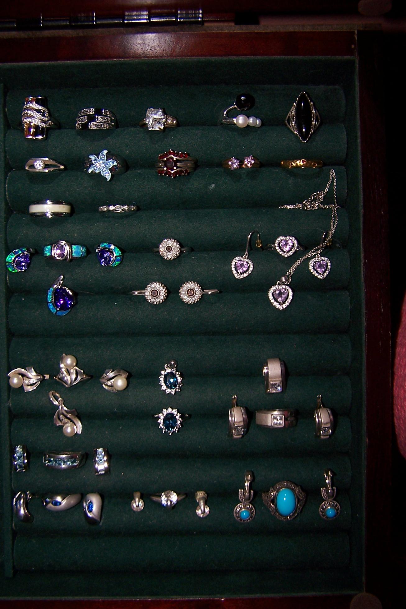 Мне хоть и особо хвастаться нечем. Но сильно хочется пять копеек вставить. Ведь мы не только о брУллиантах, но и о побрякушках. Это то что ношу постоянно. Самое любимое. По металлам не разбирала. В основном белое золото и серебро. Немного желтого золота. Между аметистов с цитринами встречаются дымчатые бриллианты и платина. Кого что заинтересует сделаю крупную фотку. И еще муж намекнул на подарок на годовщину, так что завтра отпишусь что досталось :) Самая большая страсть - серьги, и менее всего привлекают браслеты, что видно из количества. Фотки припоганые, цвета переврались. Но лучшей камеры нетути. Сразу говорю, металлы - белые, также как и жемчуг (на фотке желто-розовый)