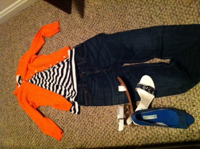 А вот и первый сет, созданный этой темой доя моего гардероба! Джинсы и оранжевая кофточка (j crew) уже были в клозете, поэтому я сразу побежала и купила матроску: С обувью вроде бы несколько подходят, но вот пока такие предположения. А еще есть кроссовки Найк белые с оранжевыми полосками( год назад покупались под свитерок)