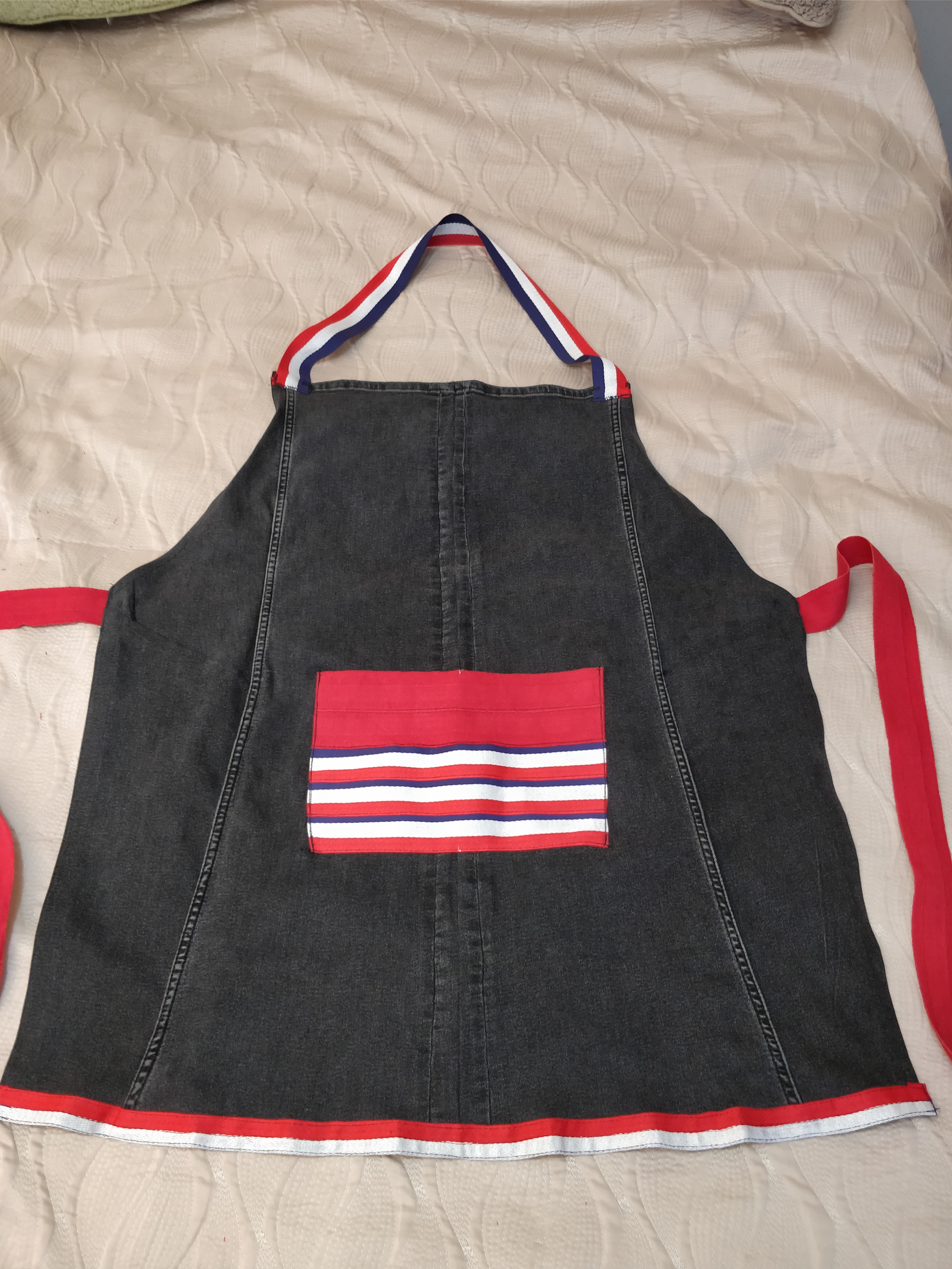 Наверное оффтоп  : из-за большого количества надоевших шмоток, скопившихся за несколько лет, я иногда рисайклю  . Ткани у многих хорошие, даже, я бы сказала , прочные - дай, думаю, фартуков нашью  И сегодня сшила фартук из старых джинсов, использовала тесьму широкую, даже карман из неё соорудила.