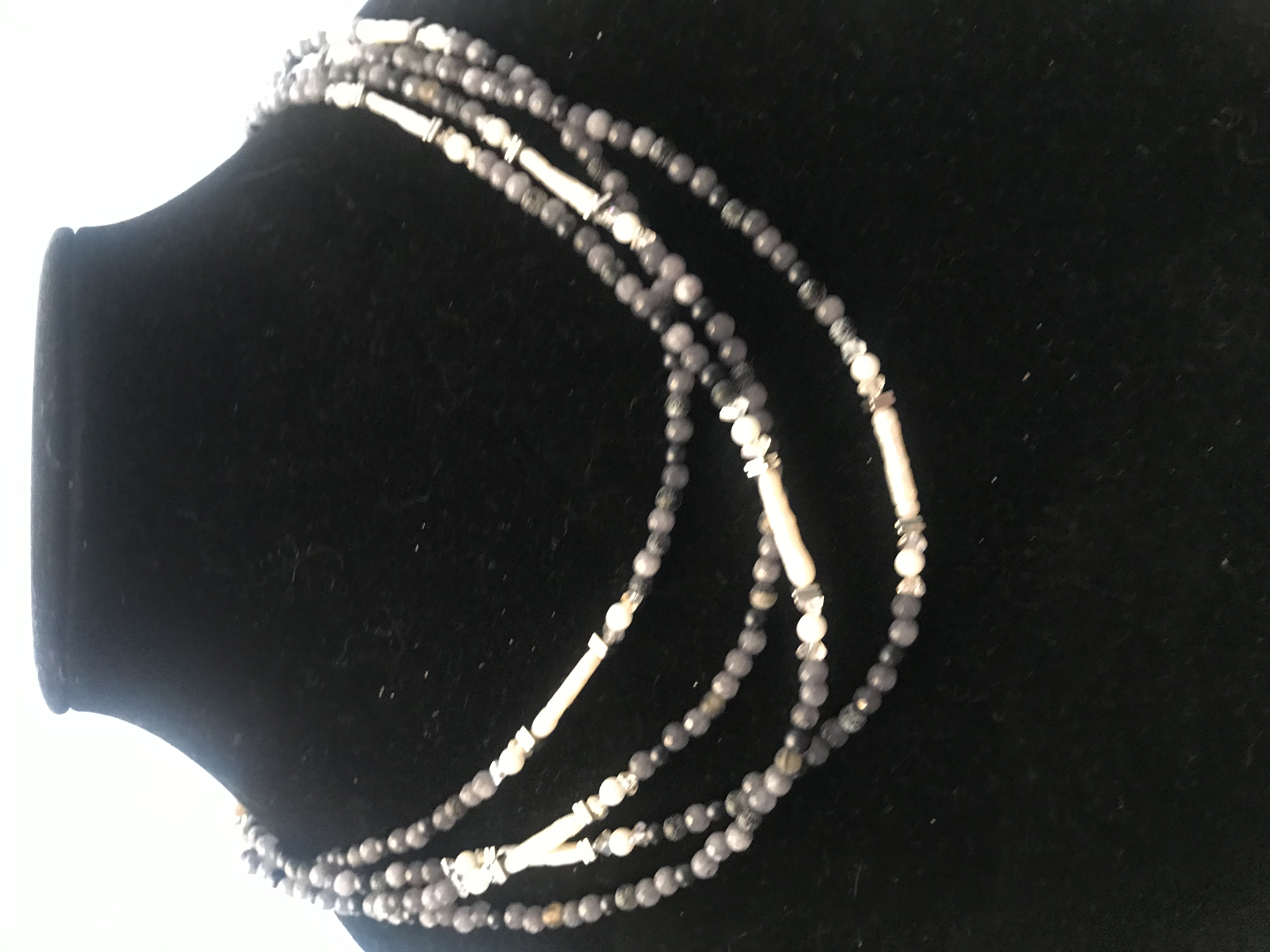 Это сотруднице на день рождени собирала в январе еще, но она это носит к комбинации с очень мелким рисом жемчуга несколько нитей, получается классно. Это white jade and blue agate ( не повеска, подвеска искусственное что то)