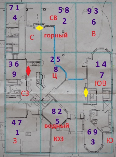 Ты наверное имеешь в виду булыжники класть не на СВ, а на ЮЗ - фронт ярд, чтобы ослабить водную 2 ? А 8 прилетает в СВ? У нас этот дворец отсутствует. Да, перепутала. Жалко что 8 не удастся использовать. Как 5 в центре нейтрализовать можно? Получается она еще распространяется на ливинг рум, т.к. из четырех секторов он большую часть комнаты занимает. У нас в этой комнате камин. Есть еще один камин, поделенный С и СВ дворцами, я камины на карте желтыми ромбами пометила и плиту на кухне красным. Плита раположена неплохо. За нее можно не переживать. Можешь там жарить-парить сколько хочешь. Ками с\св часто не жгите. Он активизирует 5-2. Вам оно не надо. Второй камин в 1-6. Как бы тоже конфликт, потому что 1-6 дает комбинацию воды, а камин все таки огонь. Но не так страшно. Просто он благоприятную 1-6 будет нейтрализовать.