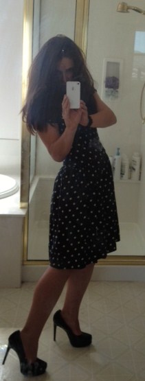 Мне кажется туфли очень выбиваются из ансамбля или просто сфотано неудачно. Может передом сфотаться и закрыть лицо телефоном? А платье симпотичное