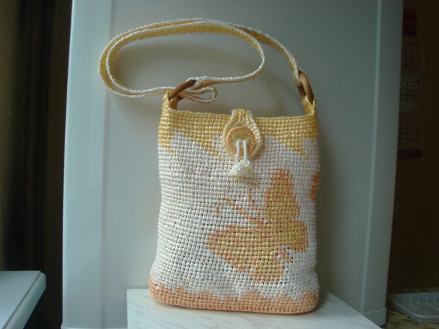 А что никто не показывает результаты? Вот моя, но что-то мне тут не нравится, ручка вот точно . Обвязывать не получается, очень плотная ткань, крючок не берет, а заостренного не нашла.То ли всю ручку заменить на вязанную, или что, или где...И форма тоже какая-то, сминается сумка в неправильном направлении, ну если набить поплотнее (как у меня обычно бывает), то, может, будет ничего. Надо было искать именно такую, как в оригинале...Кароче, что-то не то и что-то не так...