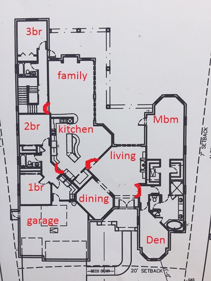 Понятно, что ниче не понятно... Я тут значится рисую план будущего дома, щас чую напланирую все в 2 и 5 А давай тогда вот в моем доме звезды расселим. Там где арки я их красным отметила, двери у нас ок 83 см шириной, в мастер свит и ден арка 100 см, между ливинг и кухней 120 см, между кухней и спальнями и фемели и лестницей и 3 спальней ок 90 см. В мастер спальню получается сначала арка, потом дверь, потом поворот и длинный коридор в саму спальню уже без дверей. Дом фасадом на ЮЗ2.