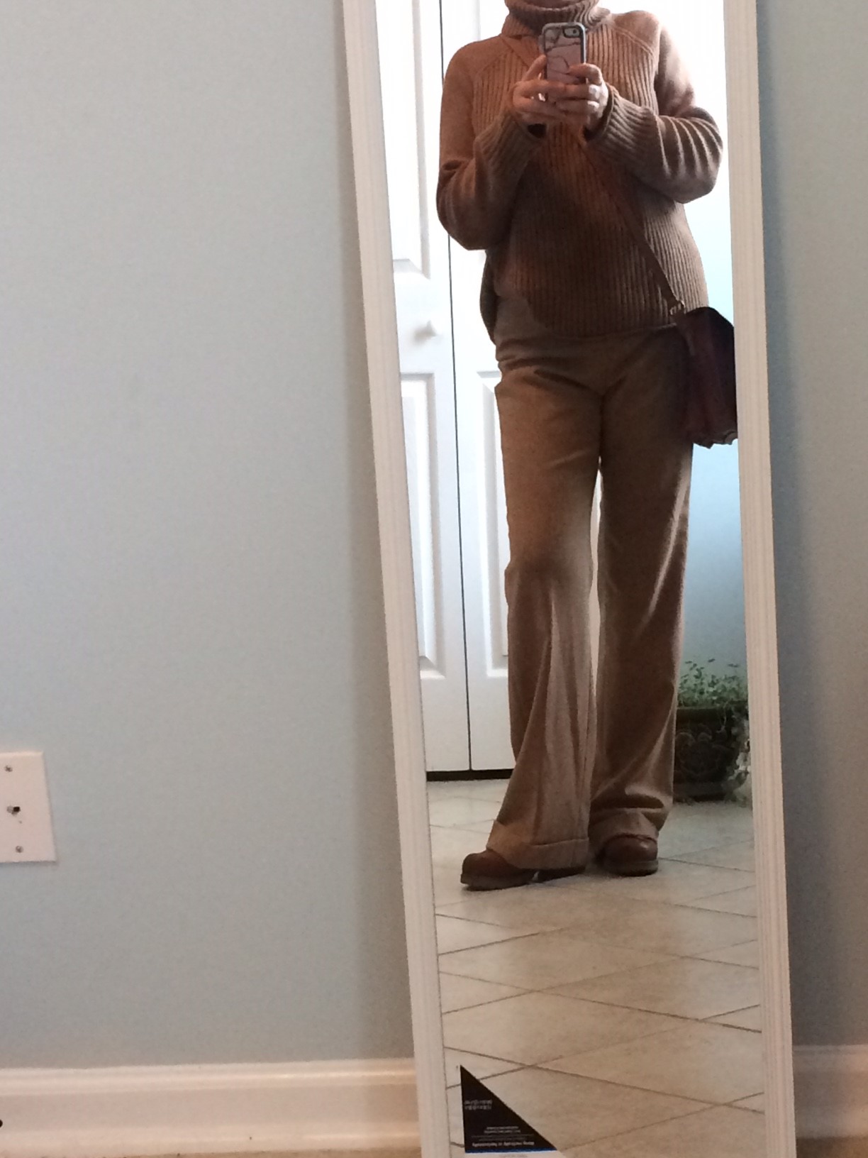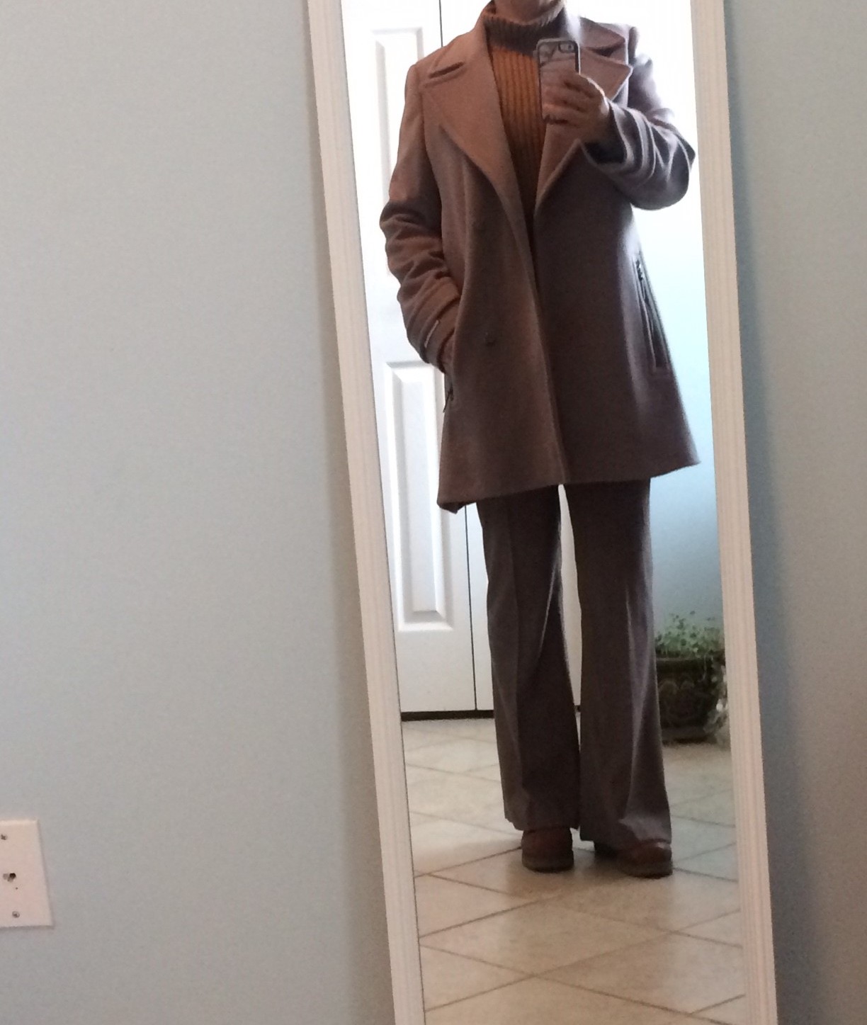 Ну уж конечно,Marlen и на этой - супер!!!!! Но....давайте приземлимся.  Звезды-они на то и звезды, чтобы быть безупречными. Вытащила брюки с подворотами,да, защипов нет, может , и не надо на мою хвигуру. Вторые брюки-те, что с пальто -тоже уже 10-летней давности. Выбрасывать не буду,  у них хороший состав ткани. Вообщем ничего особо модного, но померяла и мне понравилось. Просто классический видок. Можно критиковать! Я никогда не обижаюсь. Жду водолазку из Юникло, должна под пальто по цвету больше подойти.