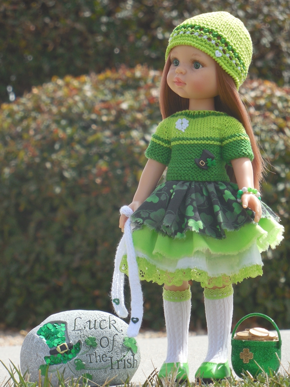 nata_se писал(а): С кукольными нарядами тут своя специфика . У нас по этому делу Grace , поищите , она даже тему открывала . Такой край делают просто отрывая ткань , потом выдернув несколько последних нитей и все . Юбку собирать можно обоими способами . Просто если все вместе оборки собирать - будет толстовато . А если ярусами , то удобнее и шов будет не такой толстый . Nata-se, спасибо за советы. Вот, сшила, связала ко дню св.патрика.