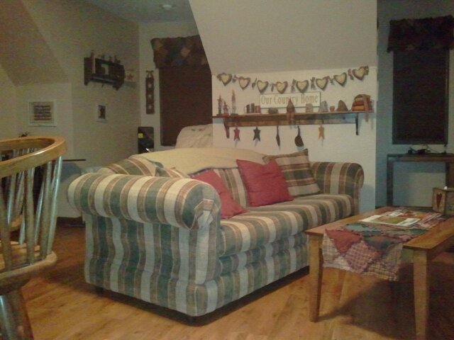 Особенно мне не понра занавески и скатерть из лоскутков. Как будто это крестьянская избушка, пардон. Деревенские мотивы мне ну совсем никак. Всего понаставлено везде и понавешано. Избавилась бы от всех этих мелочей, плюс не мешало бы ковер туда. А то совсем никакого уюта.