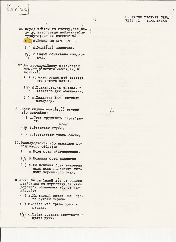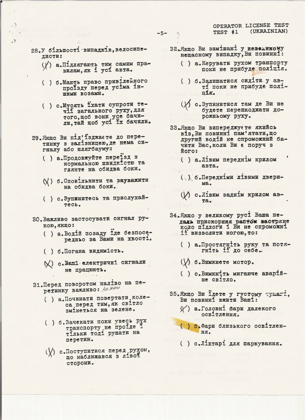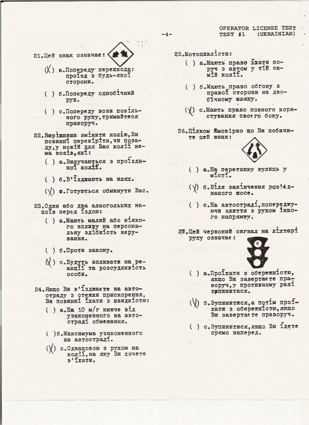 Мичиган - у меня есть тест на украинском десятилетней давности. Ловите, кто хочет. На первой и пятой страницах два вопроса с желтой пометкой - желтым выделен правильный ответ. Позавчера сдавала на русском, некоторые вопросы похожи, так что справилась. В новом тесте добавлены вопросы: ремень безопасности для детей на заднем сиденьи - до 16 лет; скорость в месте дорожных работ, если нет знака - не помню правильный вариант, но можно поискать; время на принятие решения в какой-то ситуации на дороге 12 секунд (я ответила неправильно - 4); больше не помню, волновалась очень :). Еще был дополнительно листок с 10 вопросами по знакам на английском, разрешили мужу сесть рядом (типа он мне переведет с английского на русский :)), но он мне просто шептал правильный вариант, если я сомневалась. Половину сама ответила точно, а если англисйкий знать лучше, то любой ежик справится, простая логика.