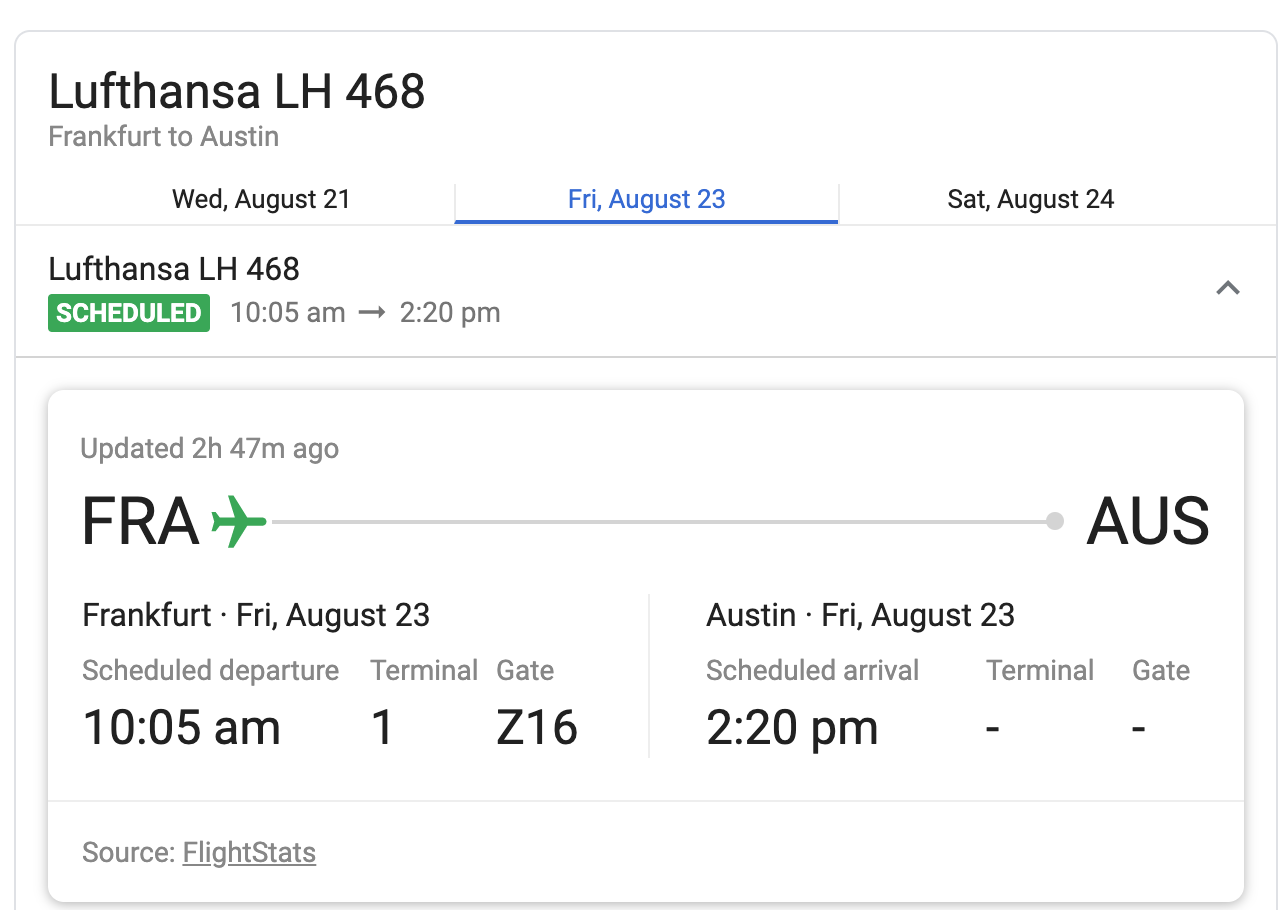 HELENKA писал(а): А узнать разные ли терминалы никак? Рейс Питер-Франкфурт-Остин Если знаете номер рейса, то можно погуглить, с Аэрофлотом такое проходит.
