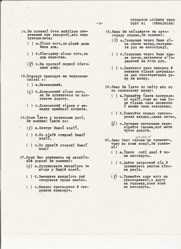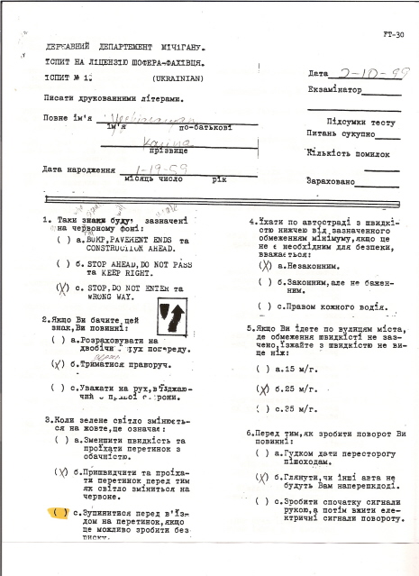 Мичиган - у меня есть тест на украинском десятилетней давности. Ловите, кто хочет. На первой и пятой страницах два вопроса с желтой пометкой - желтым выделен правильный ответ. Позавчера сдавала на русском, некоторые вопросы похожи, так что справилась. В новом тесте добавлены вопросы: ремень безопасности для детей на заднем сиденьи - до 16 лет; скорость в месте дорожных работ, если нет знака - не помню правильный вариант, но можно поискать; время на принятие решения в какой-то ситуации на дороге 12 секунд (я ответила неправильно - 4); больше не помню, волновалась очень :). Еще был дополнительно листок с 10 вопросами по знакам на английском, разрешили мужу сесть рядом (типа он мне переведет с английского на русский :)), но он мне просто шептал правильный вариант, если я сомневалась. Половину сама ответила точно, а если англисйкий знать лучше, то любой ежик справится, простая логика.
