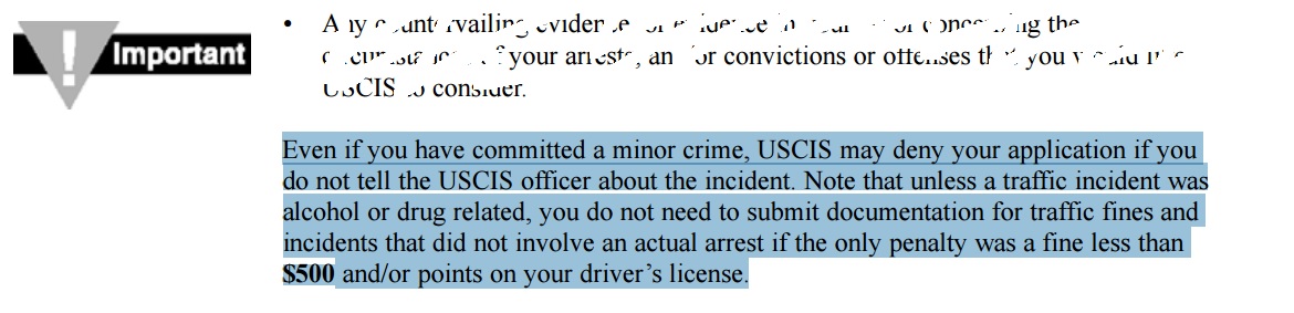 Sunshine_Lina писал(а): Девочки, очень-очень нужен ваш совет. Заполняю форму N-400 на гражданство по замужеству (через 3 года) и возник вопрос в Part 12. Пару месяцев назад получила штраф за превышение скорости. Штраф был оплачен без похода в суд. Нужно ли мне отметить пункт 23. Have you EVER been arrested, cited, or detained by any law enforcement officer for any reason? Если нужно, то посмотрите корректно ли заполнено? Пожалуйста подскажите кто имел подобный опыт!  У меня тоже speeding citation, я так понимаю сообщить все равно нужно, но документы никакие по этому поводу слать не надо? (у меня ничего и нет, так как оплатила сразу)