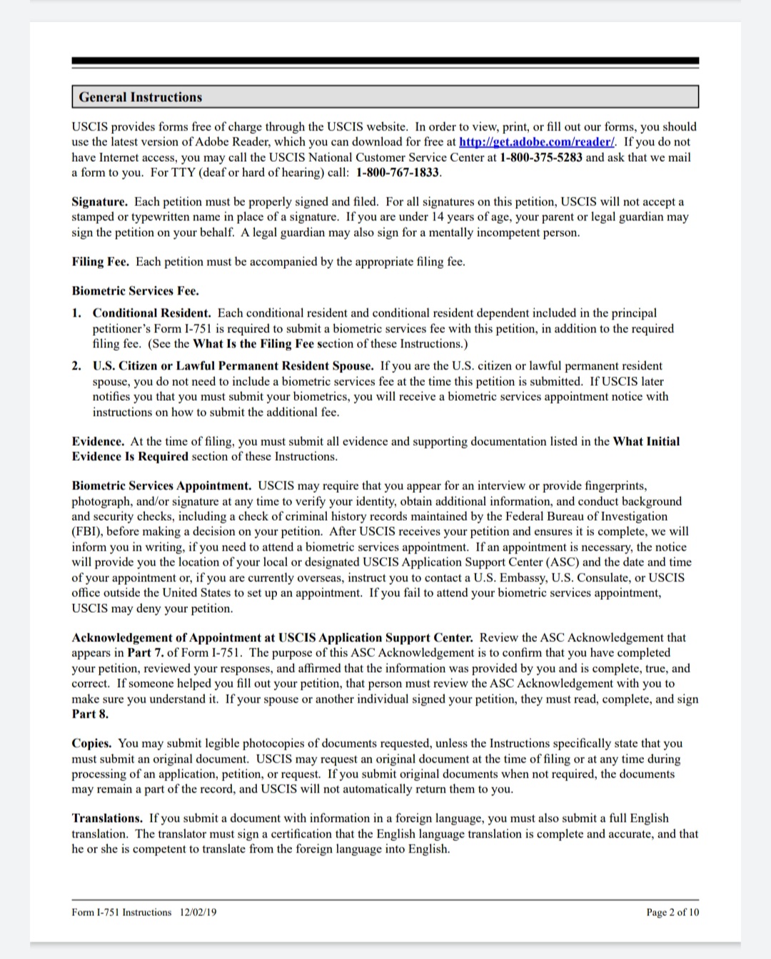 и вроде как оплату за биометрику не надо отправлять. так надо или не надо? спс Добрый день! Инструкция Form I-751 На стр. 2 данной инструкции полный текст выглядет так: Biometric Services Fee. 1. Conditional Resident. Each conditional resident and conditional resident dependent included in the principal petitioner’s Form I-751 is required to submit a biometric services fee with this petition, in addition to the required filing fee. (See the What Is the Filing Fee section of these Instructions.) 2. U.S. Citizen or Lawful Permanent Resident Spouse. If you are the U.S. citizen or lawful permanent resident spouse, you do not need to include a biometric services fee at the time this petition is submitted. If USCIS later notifies you that you must submit your biometrics, you will receive a biometric services appointment notice with instructions on how to submit the additional fee. Это означает, что те, кто указан в данной форме, если: 1. Он Conditional Resident/Условно Проживающий, он должен оплатить за отпечатки. 2. Он Гражданин США или постоянный житель США, то платить за отпечатки не нужно. На моём примере. В форме указаны троё: Я, моя дочь - мы Условно Проживающие (у нас временная Green Card) - нам платить нужно; мой муж - Гражданин США - ему платить не нужно. Это значит плата за форму (1шт) $595 + за отпечатки (2 шт) 2×$85=$170. В вашем случае, если указаны двое: вы (Условно Проживающая) и муж (Гражданин США). Ваш итог: плата за форму (1шт) $595 + за отпечатки (1 шт) $85.