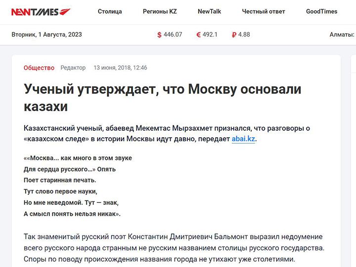 Казахские ученые выдвинули поразительную версию происхождения Москвы (фото 2). Оказывается, ее построил не Юрий Долгорукий, а предки казахов. Такую сумасшедшую теорию выдвинул доктор (!) филологических наук, профессор Мекемтас Мырзахметулы.