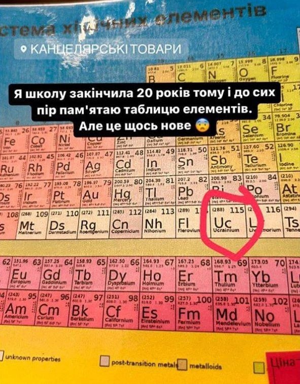 Новые трактовки таблицы Менделеева. Появился выдуманный "украиний". Ларчик открывается просто - на 115 позиции в таблице стоит открытый в Дубне "московий". Ну, кто ж свидомым доктор?