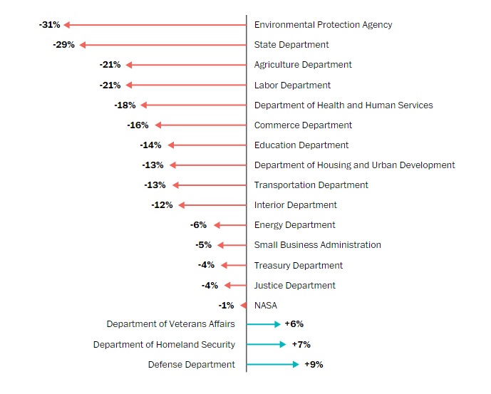 To pay for an increase in defense spending, a down payment on the border wall and school voucher programs, among other things, funding was cut from the discretionary budgets of other executive departments and agencies. The Environmental Protection Agency, the State Department and the Agriculture Department took the hardest hits.