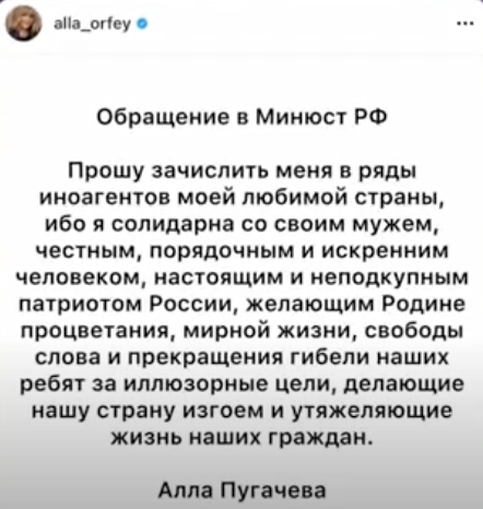 ПУГАЧЕВА ПРОТИВ ПУТИНА И ВОЙНЫ. ТЯЖЕЛЫЙ УДАР ПО ПРОПАГАНДЕhttps://www.youtube.com/watch?v=AgD7nu_u02wЦитата: Что-то модно, что-то вышло из моды, а что-то вечно. К последней категории относится авторитет Аллы Пугачёвой. Её пост против войны, развязанной Владимиром Путиным, привёл к эффекту разорвавшейся бомбы. Пугачёва влияет, в первую очередь, на ядерный электорат Путина, а не на условного слушателя Оксимирона и Нойза. Кто-то говорит, что Кремль нажил себе очень могущественного врага, и это сильное поражение в борьбе за умы, кто-то твердит, что ничего не поменяется, а Пугачёва уже ни на что не влияет. Кто прав и какие последствия будут у антивоенного высказывания самого известного человека России? Об этом – в новом ролике.