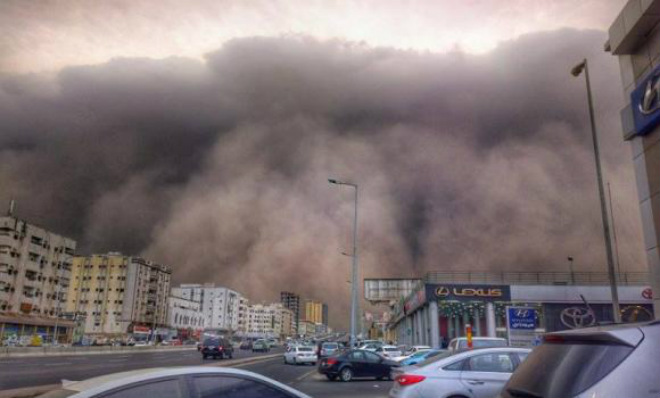 В Джидде, Саудовская Аравия, апокалиптическая песчаная буря нарушила авиасообщение сегодня 18:40 Массивная песчаная буря, охватившая большую часть Ближнего Востока во вторник, погрузила город Джидда в полную темноту в 18:00 (по местному времени). Буря длилась в городе, расположенном в западной части Саудовской Аравии, в течение 40 минут. Ветер, поднявший песок, был настолько сильным, что во многих районах стучали окна. Из-за мощного ненастья на некоторое время прекратил свою работу новый международный аэропорт «Король Абдул Азиз» в Джидде. Входящие рейсы были перенаправлены в соседние аэропорты, в то время как некоторые другие отменены или приостановлены. Семь рейсов были перенаправлены в Медину, Янбу и в Таиф. К 19:00 работа воздушной гавани возобновилась. Сотрудники гражданской обороны получили сигналы бедствия от жителей города, которые хотели бы знать, что происходит. Буря была похожа на картинку из фильма об апокалипсисе