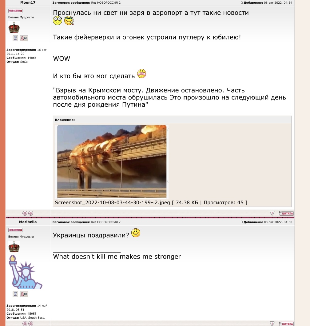 Радостные такие, светлые лица! Прямо как у нас на форуме.. Ukrainians celebrate as explosion destroys Crimea bridge crucial to Russia.https://www.youtube.com/watch?v=97kUC2MfKps