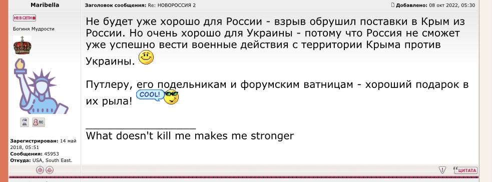 magnolia писал(а): Гуча, включи логику, мост охраняется российской стороной 7/24, в охрану и в детекторы вбухано 2 млрд. рублей, как бы они пропустили грузовик такой с взрывчатками если был бы он вражеский?  Это сами же "своего" и пропустили на мост службами ФСБ.  Maribella писал(а): Не будет уже хорошо для России - взрыв обрушил поставки в Крым из России. Но очень хорошо для Украины - потому что Россия не сможет уже успешно вести военные действия с территории Крыма против Украины. Путлеру, его подельникам и форумским ватницам - хороший подарок в их рыла!  кто выгодопреобретатель тебе мари рассказала