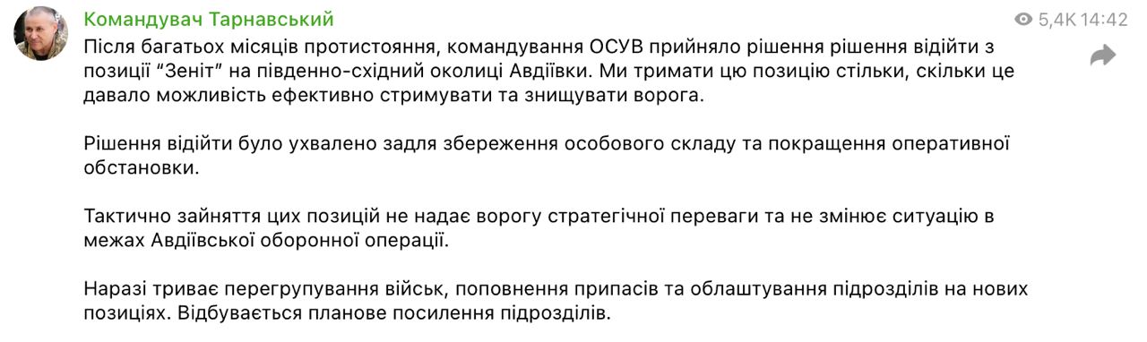 "После многих месяцев противостояния, командование ОСУВ приняло решение решение отойти с позиции "Зенит" на юго-восточную окраину Авдеевки. Решение отойти было принято для сохранения личного состава и улучшения оперативной обстановки", — написал он.