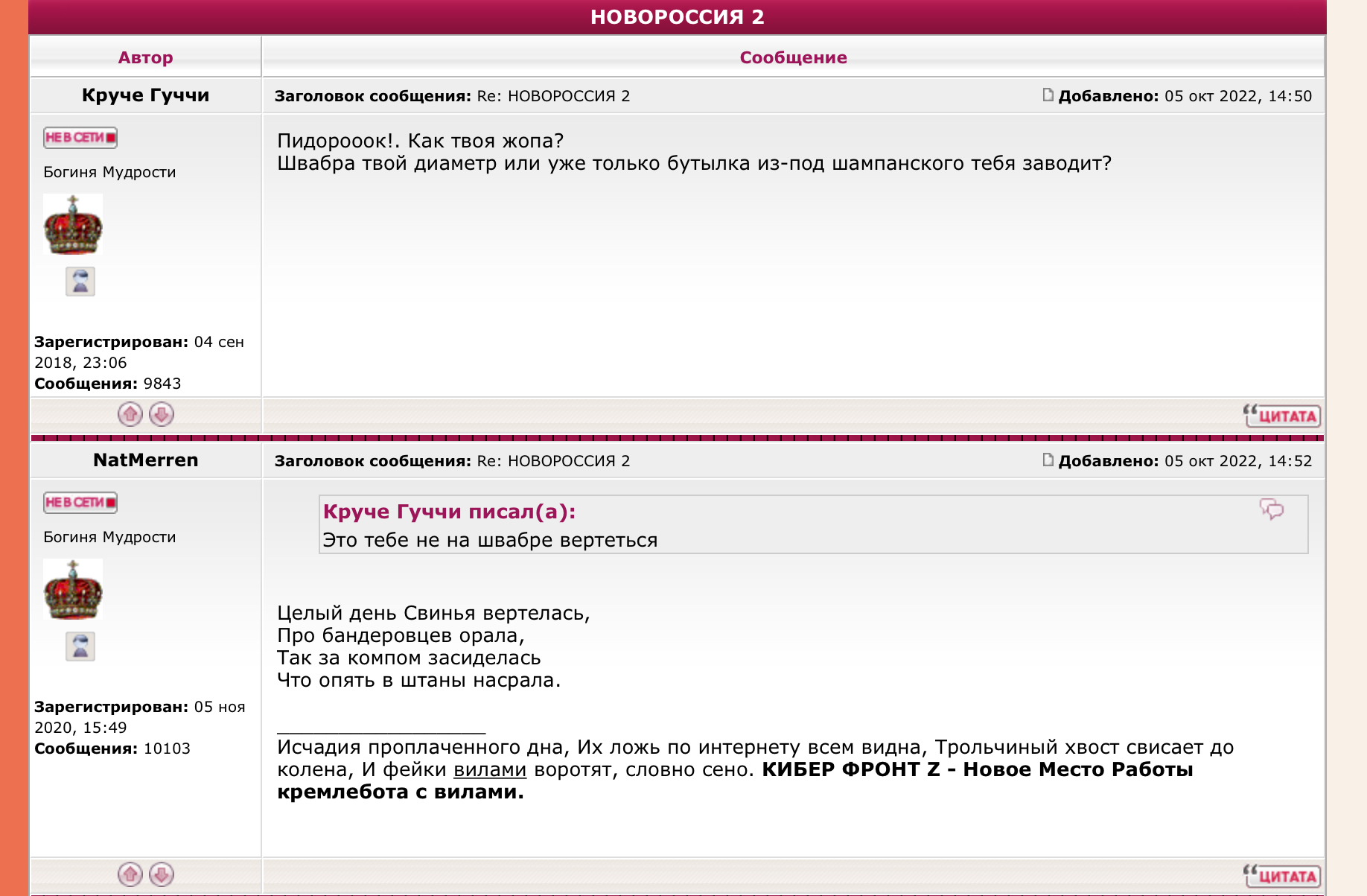 тееррорисы  Что, Свинья, лапы трясутся? Копытки затупились слегка.  Ой, Гуча, не смеши народ. Ты чё с этим пидорком в одной обойме? Не позорься.Фубля. "Не лучше ль на себя, кума, оборотиться?"  И позориться самой прекратить, взрослая, вроде, женщина.