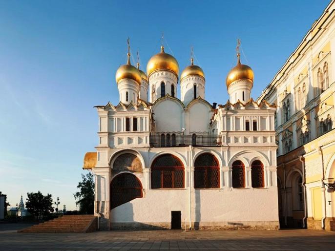 Благовещенский собор был построен псковскими зодчими в конце XV века. С незапамятных времен на этом месте находились домашние церкви московских правителей. Государи могли молиться здесь в уединении: от дворца к храму шел закрытый со всех сторон переход. Даже сейчас через внутренние двери Благовещенского собора можно выйти в Большой Кремлевский Дворец – бывшую императорскую резиденцию.