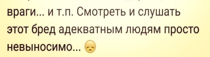 Baylee писал(а): Azalia писал(а): Как то так Так все очень просто: не нравится- не смотрите  Если бы все так просто было. Приходится же ездить туда, общаться со знакомыми, друзьями и родственниками. У некоторых реально крыша течет. Сейчас, конечно, все поменялось. Поездки отменяются на неопределенный срок. Пока П у власти, ездить, наверное, мало кто будет. Общение со всеми сведено к минимуму, с кем-то вообще прекращено. Я не могу продолжать общаться с людьми, которые, сидя в жопе, считают русских высшей нацией, несующую миссию миру, а весь мир дебилами. Захлебывающихся при этом в ненависти ко всему миру, ставящих классы под постами, пропагандирующими военную угрозу Америке в т. ч. Эта нация сошла с ума.