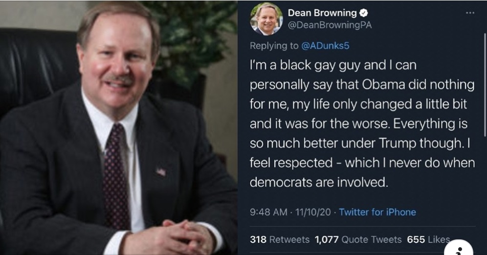 White Conservative Forgets To Switch Accounts Before Tweeting As “A Black Gay Guy” A self-described “Christian conservative” and former commissioner for Lehigh County in Pennsylvania was caught seemingly attempting to impersonate a gay Black man in order to defend Donald Trump. In a now-deleted but screengrabbed tweet, Dean Browning described himself as “a black gay guy” to claim that former President Barack Obama did nothing for him and that his life got better under Trump.