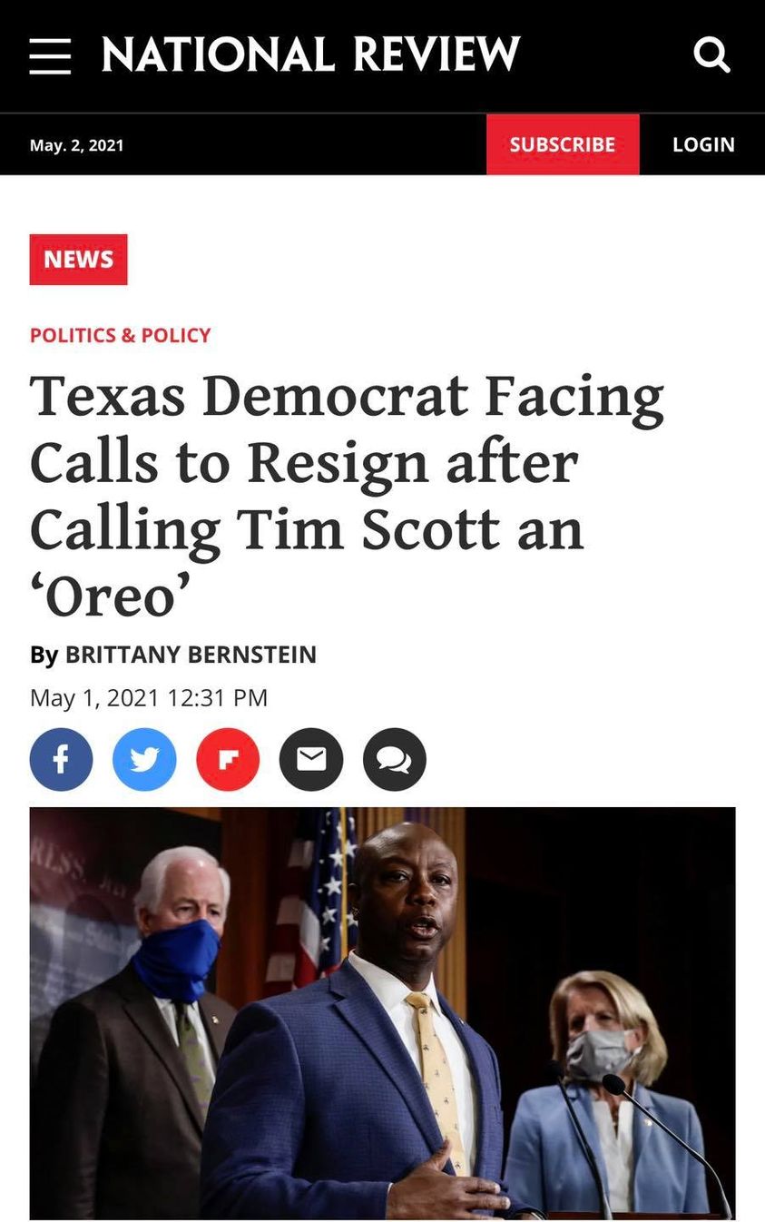 Texas Democrat Facing Calls to Resign after Calling Tim Scott an ‘Oreo’ https://www.nationalreview.com/news/texas-democrat-facing-calls-to-resign-after-calling-tim-scott-an-oreo/