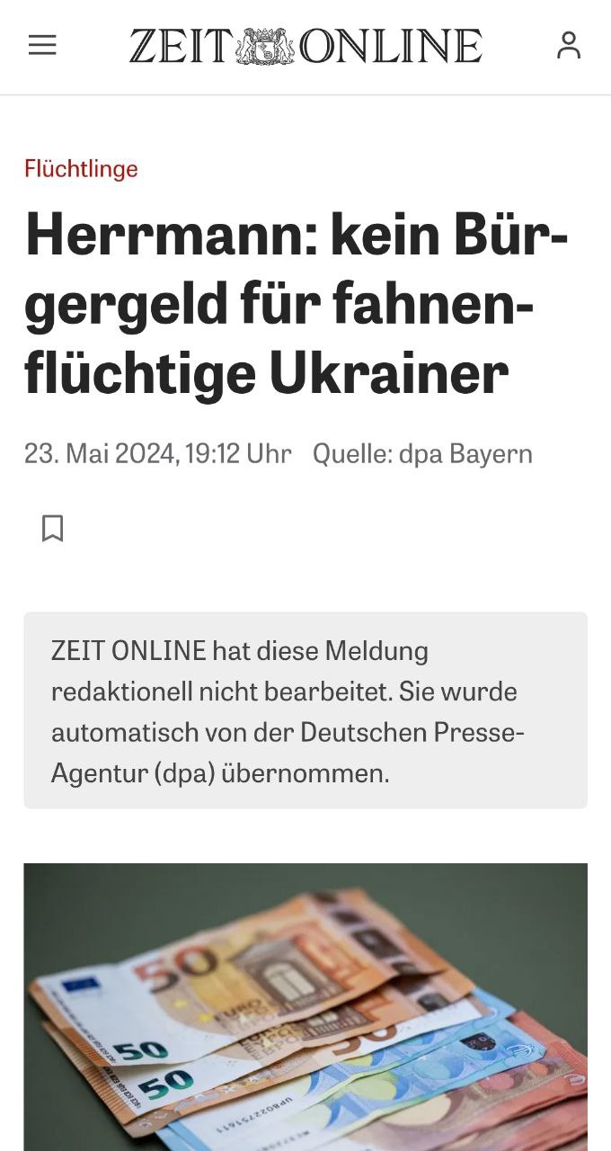 Министр внутренних дел Баварии Йоахим Херрманн (https://www.zeit.de/thema/joachim-herrmann) призывает при продлении статуса беженца украинцам призывного возраста лишать их социального пособия. (c)