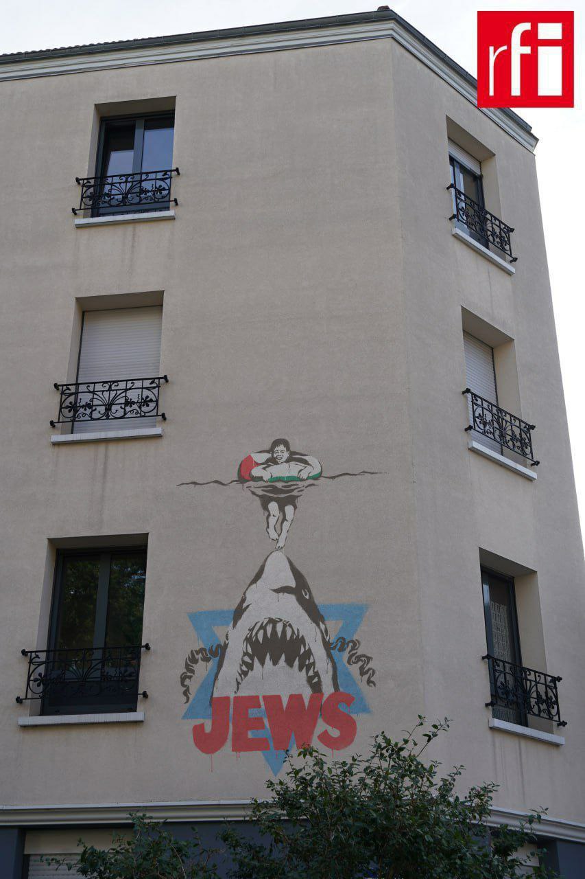 Появилось граффити с акулой-евреем, по мотивам фильма "Челюсти". Огромная акула-еврей надвигается на ребёнка, который плавает на надувном круге в цветах палестинского флага (с)