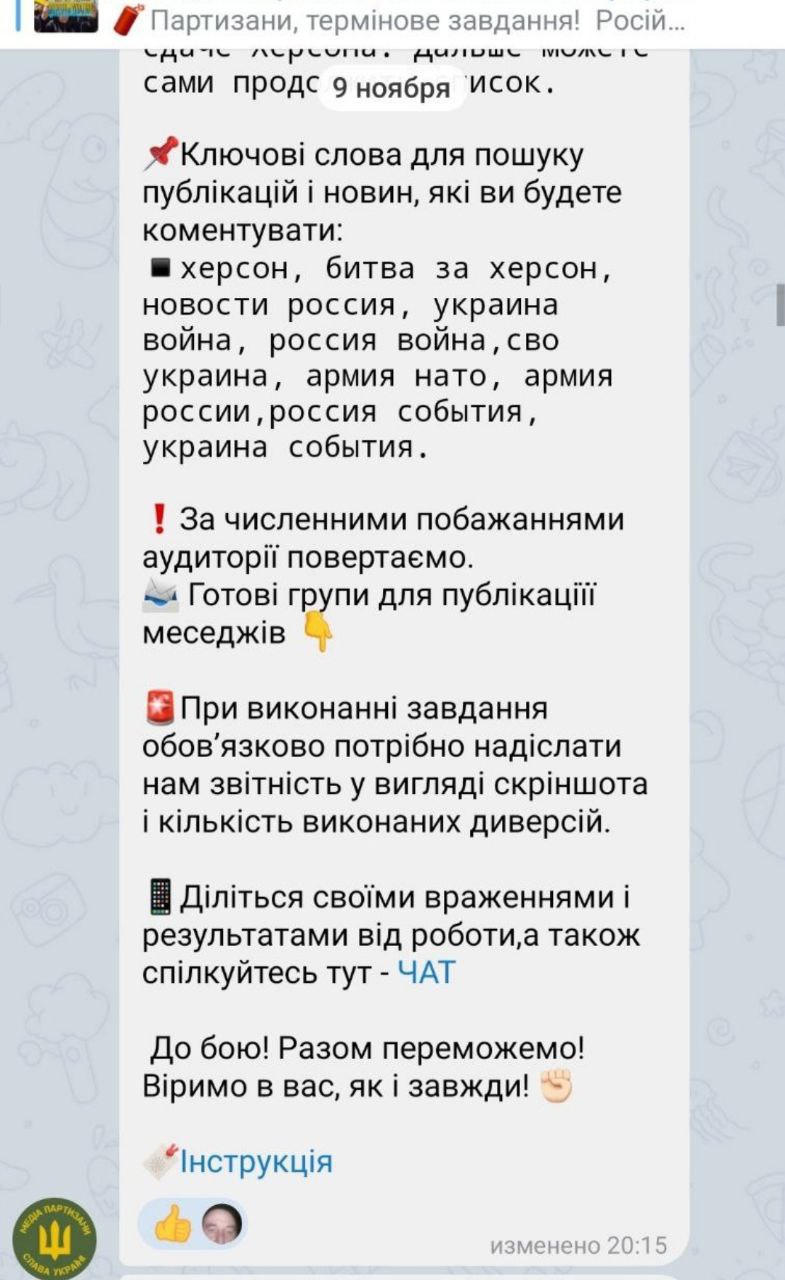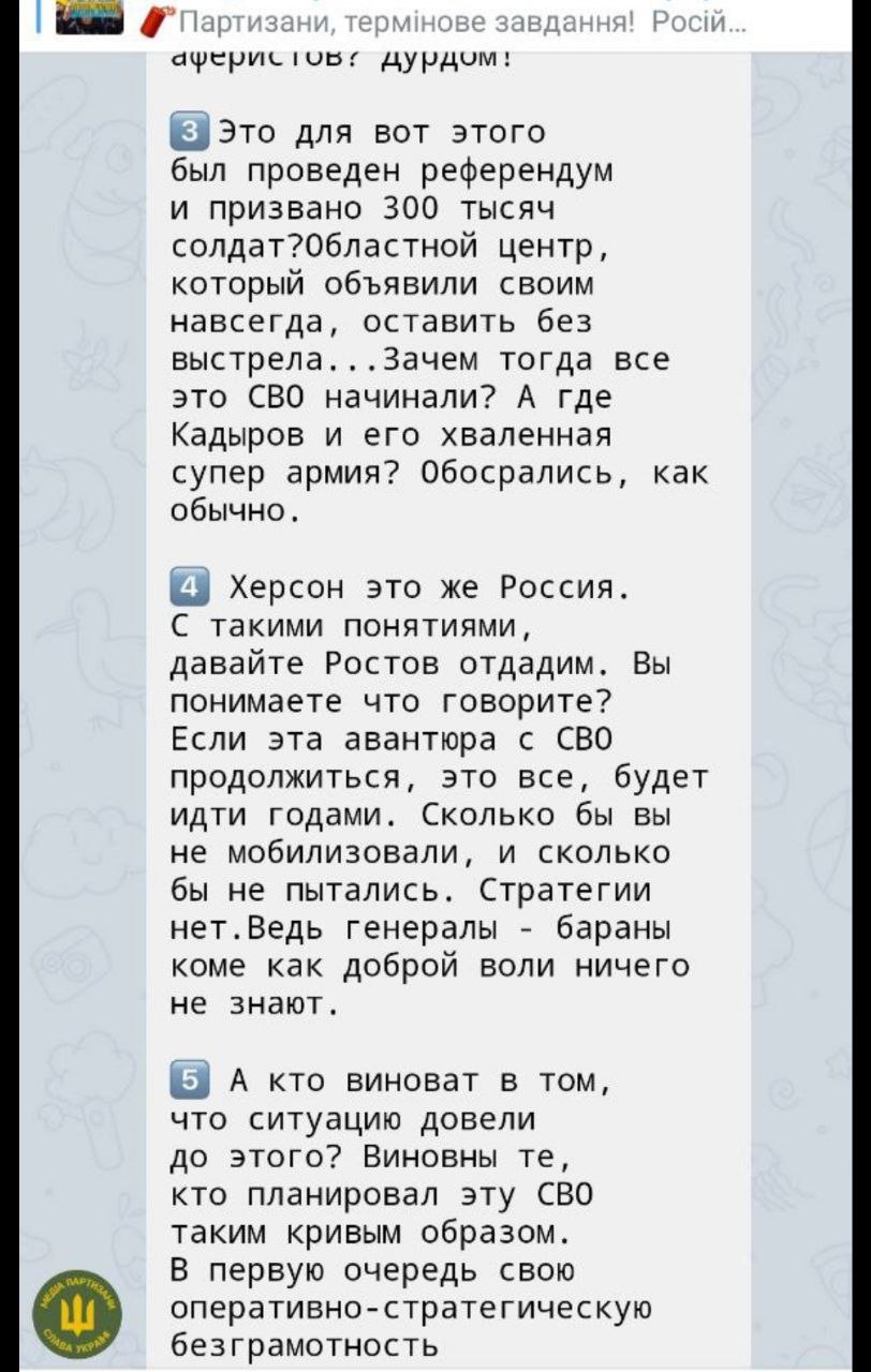 Telegram (https://t.me/boris_rozhin/69818) Colonelcassad Пропагандистские тезисы ИПСО для освещения отвода российских войск с правобережья.
